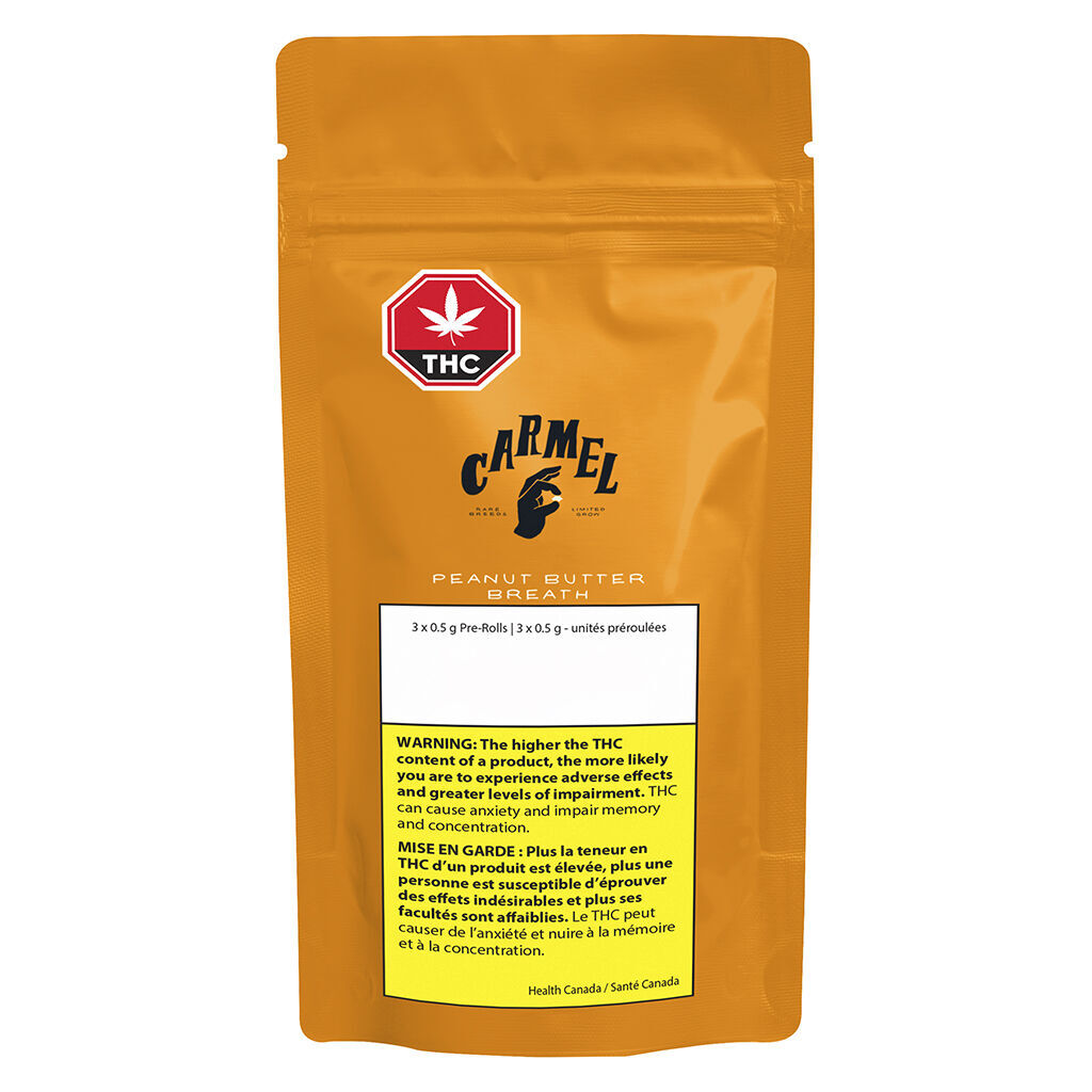 Bred by Thug Pug, Peanut Butter Breath is a creation of crossing Dosidos with Mendobreath. Tight resin covered buds feature vibrant purple shading that really make this one pop. Peanut Butter Breath has some of the best bag appeal you will ever see. The aroma is sweet with subtle floral notes. The smoke is heavy with nutty and chocolate flavours that will keep you coming back over and over again. Because it’s just the right thing to do, all our flower is hang dried, hand trimmed, and slow cold cured. Carmel pre-rolls are made with whole flower, never trim. Each pre-roll is hand filled, twisted and packaged. Non irradiated, obviously.